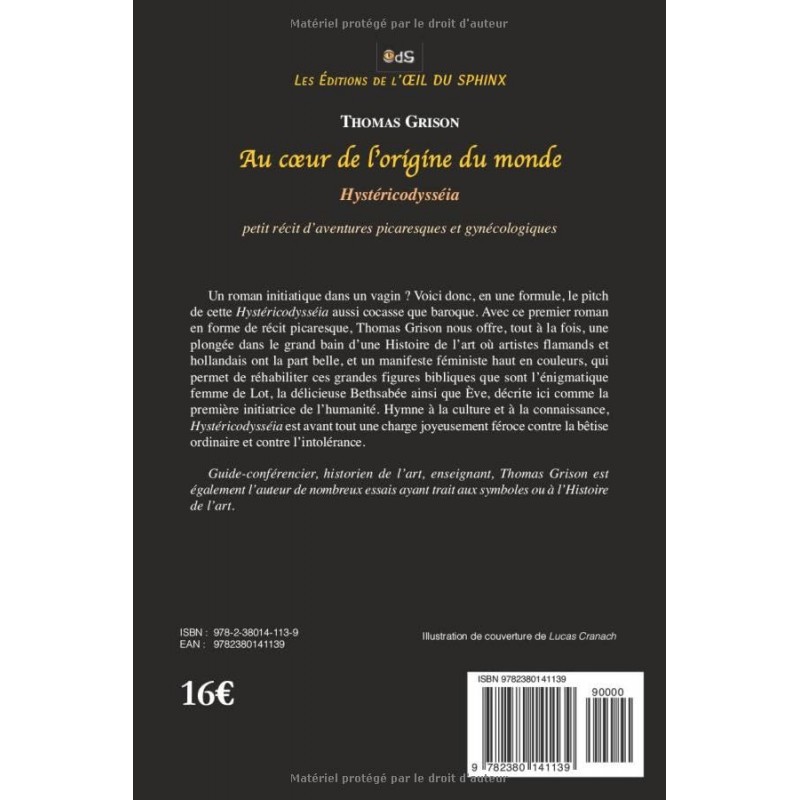 Un roman initiatique dans un vagin ? Voici donc, en une formule, le pitch de cette Hystéricodysséia aussi cocasse que baroque. Avec ce premier roman en forme de récit picaresque, Thomas Grison nous offre, tout à la fois, une plongée dans le grand bain d’une Histoire de l’art où artistes flamands et hollandais ont la part belle, et un manifeste féministe haut en couleurs, qui permet de réhabiliter ces grandes figures bibliques que sont l’énigmatique femme de Lot, la délicieuse Bethsabée ainsi que Ève, décrite ici comme la première initiatrice de l’humanité. Hymne à la culture et à la connaissance, Hystéricodysséia est avant tout une charge joyeusement féroce contre la bêtise ordinaire et contre l’intolérance.